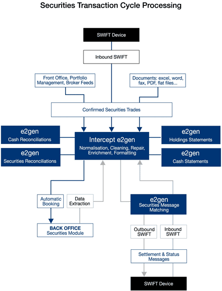 Securities Transaction Cycle components cover all aspects of securities processing, from any source including SWIFT, Front Office, e-banking, proprietary and value added networks. The complete cycle from trade initiation to message matching, settlement and reconciliation is managed automatically.