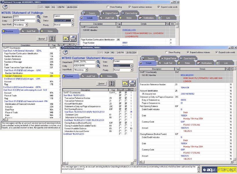 e2gen statement modules provide the ability to produce enhanced cash and securities holding reporting to counterparties, correspondents and clients. The solutions provide configurable day end and intra day statement output for automating the production of SWIFT compliant messages. Output can also be configured for delivery to third party reconciliation modules, electronic banking systems, email, facsimile and paper.